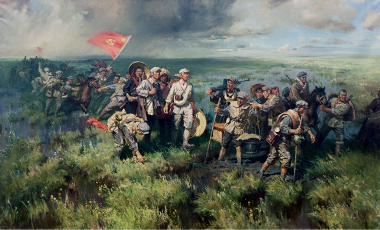 The most dangerous leg of the Long March was actually the grasslands — no human habitation, no real food, no clean water, just grass and marshes for hundreds of miles. In addition to the threat of starvation, Long Marchers could easily fall and drown in the waterways, if not careful. Yet this painting by Zhang Wenyuan, depicts this part of the journey with a certain dignity and determination, with one Marcher reaching down, perhaps to pick some grass to nibble on, or perhaps a flower to admire.